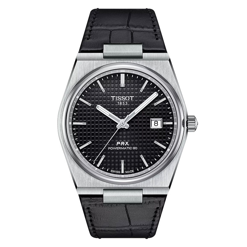 New Tissot PRX Powermatic 80 watch, 40mm in stainless steel with a black dial, sapphire crystal, black leather strap, tang buckle, and automatic movement.