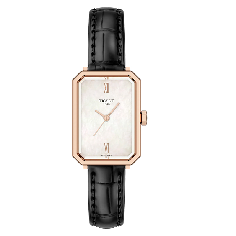 New Tissot SRV watch, 30 x 22mm in stainless steel & yellow gold PVD with a mother-of-pearl dial, sapphire crystal, black leather strap, folding clasp, and quartz movement.