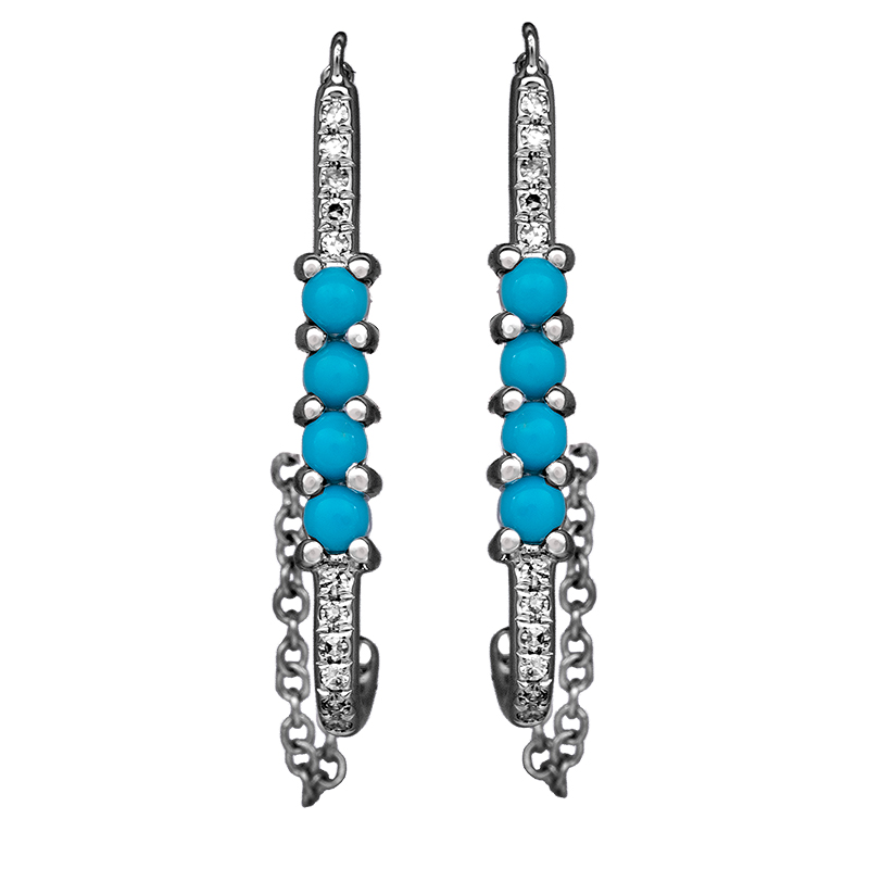 New 14k white gold Venetti bar earrings set with 0.38 carats of round cabochon turquoise & 0.06 carats of round brilliant diamonds.