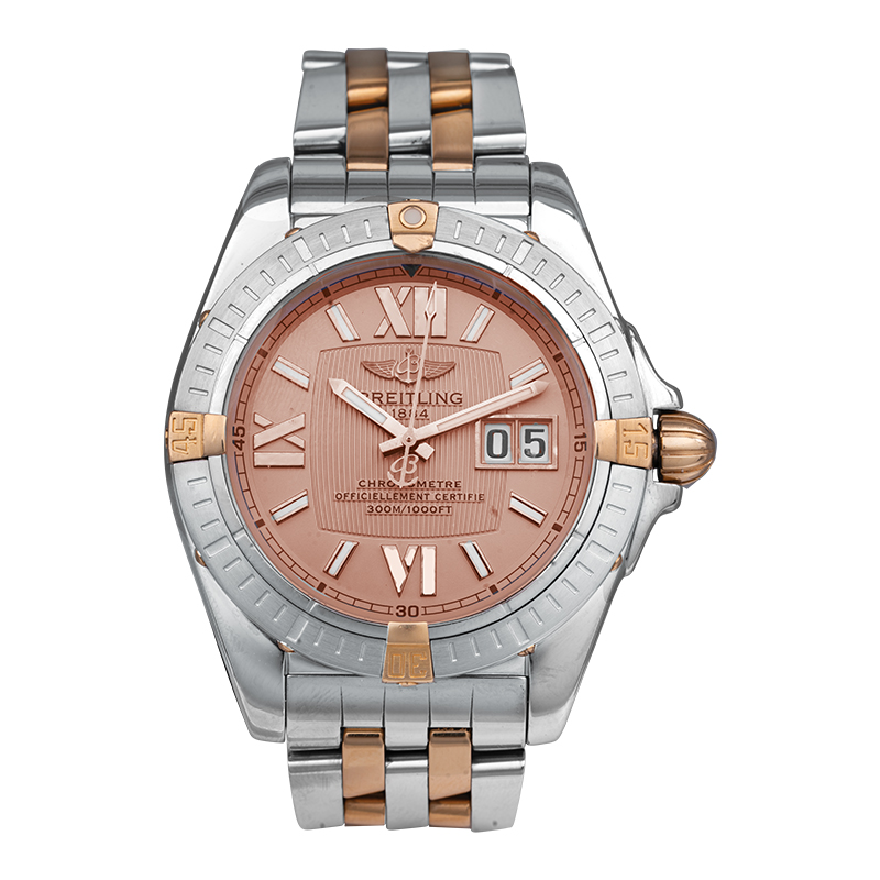 Pre-owned Breitling Cockpit watch, 41mm in stainless steel & 18k yellow gold with a salmon dial, sapphire crystal, folding clasp, and automatic movement.