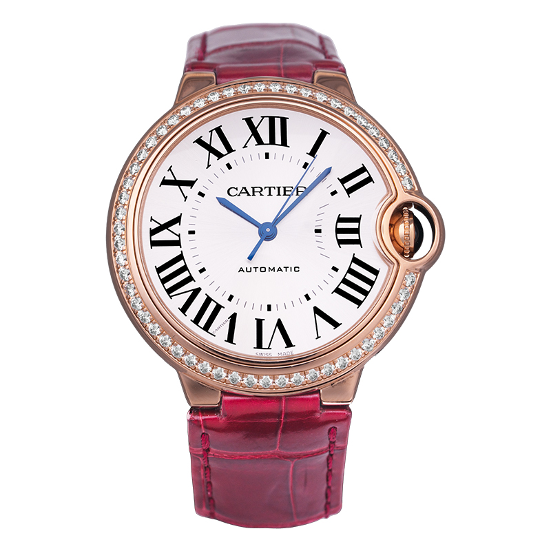 Pre-owned Cartier Ballon Bleu watch, 36mm in 18k rose gold with a silver dial, sapphire crystal, diamond bezel, burgundy leather strap, tang buckle, and automatic movement with box & card.
