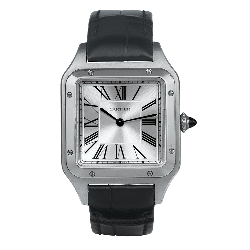 Pre-owned Cartier Santos-Dumont watch, 43.5 x 31.4mm in stainless steel with a silver dial, navy blue leather strap, tang buckle, and quartz movement with box & card.
