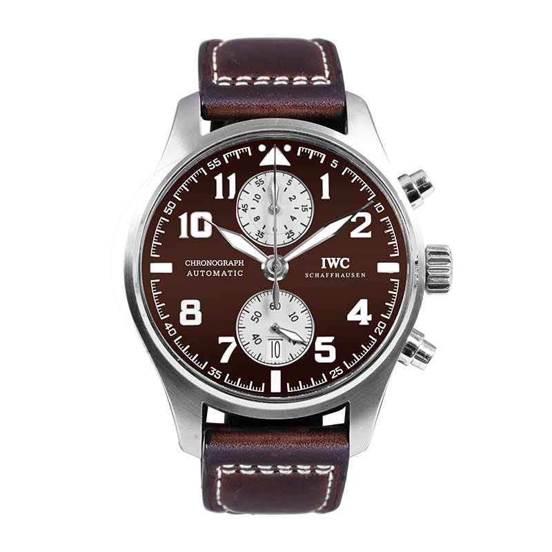 Pre-owned IWC Pilot Spitfire St. Exupery Chrono watch, 43mm with a brown dial, brown leather strap, folding buckle, and automatic movement.