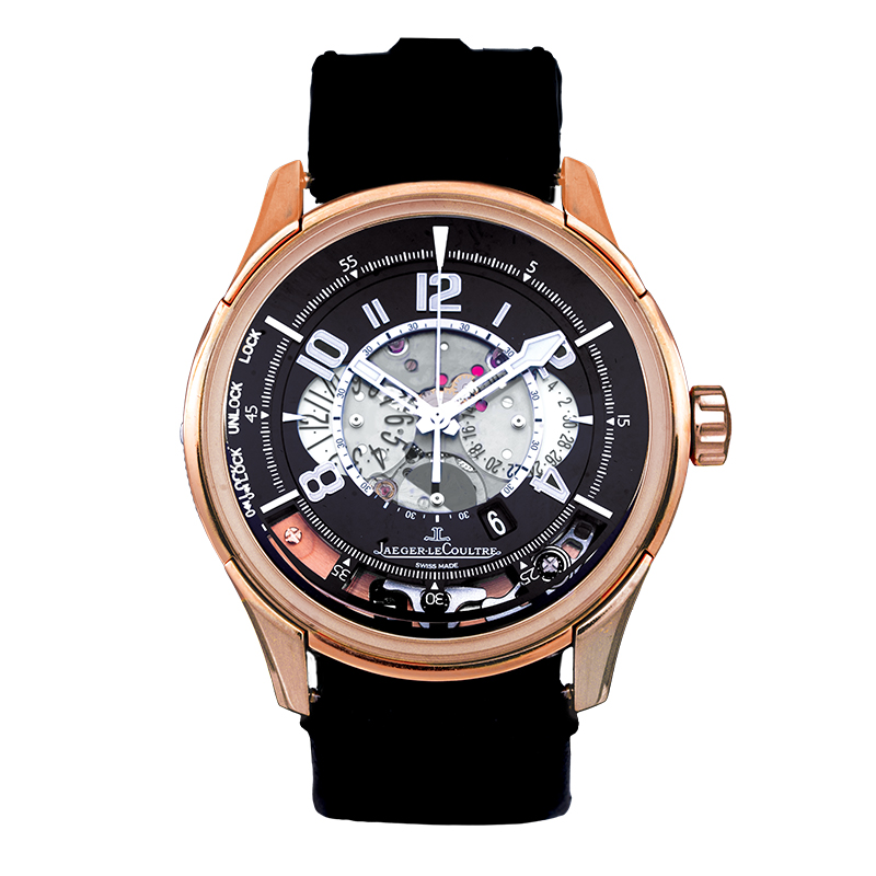 Pre-owned Jaeger-LeCoultre Aston Martin AMVox2 Chronograph watch, 42mm in 18k rose gold with a black skeleton dial, black leather strap, folding clasp, and automatic movement.