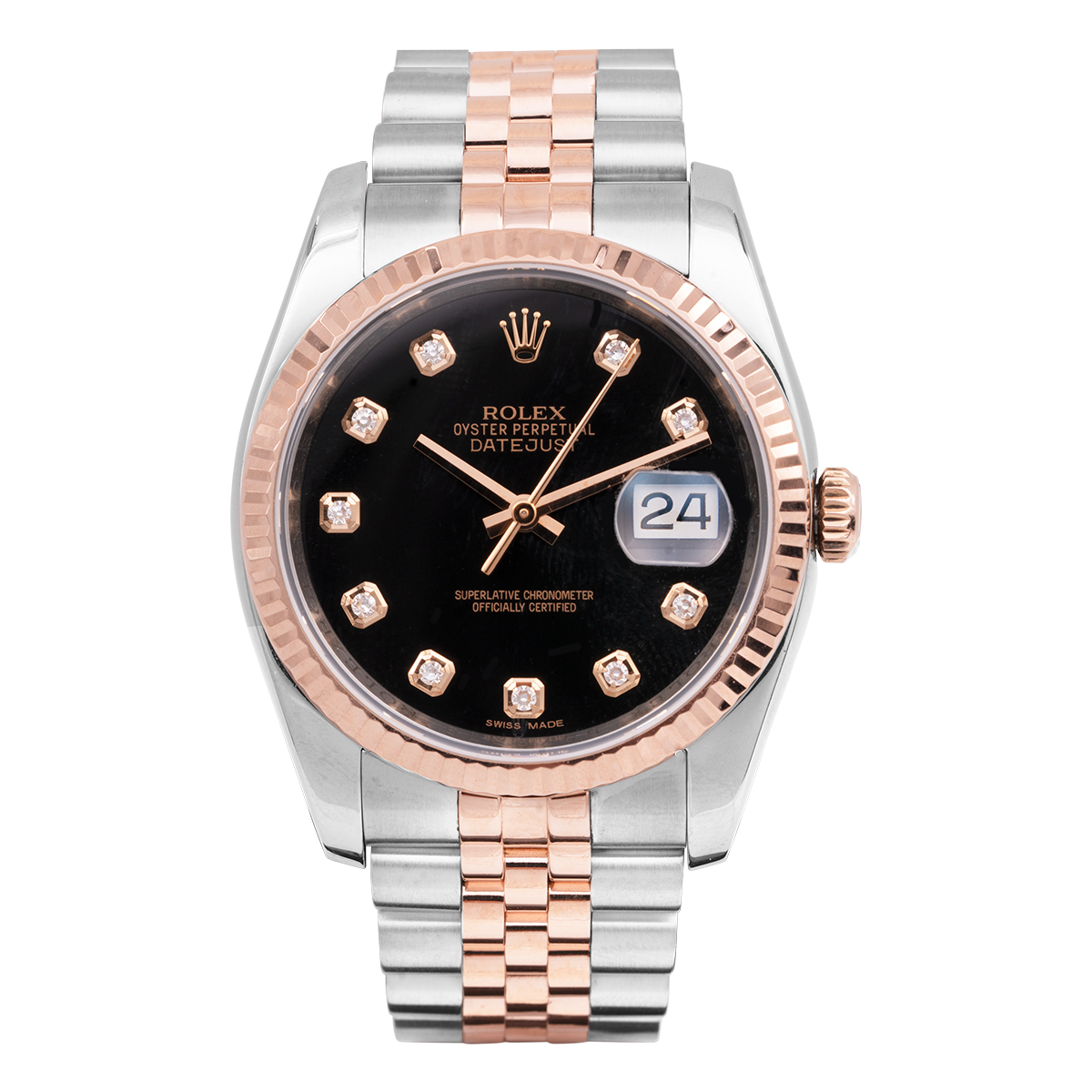 Pre-owned men’s Rolex Datejust watch 36mm in 18k rose gold & stainless steel with a black diamond dial, sapphire crystal, 18k rose gold bezel, Jubilee bracelet, folding clasp, and automatic movement.