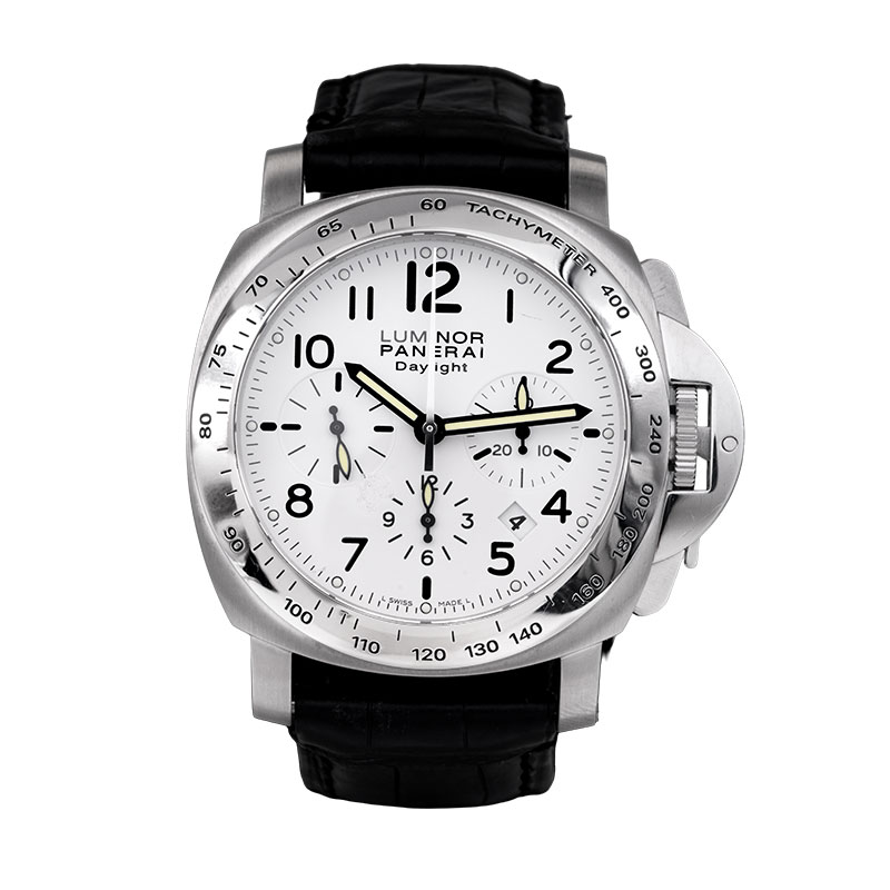 Pre-owned Panerai Luminor Daylight Chrono PAM188 watch, 44m in stainless steel with a white dial, black leather strap, folding clasp, and automatic movement with box & papers.