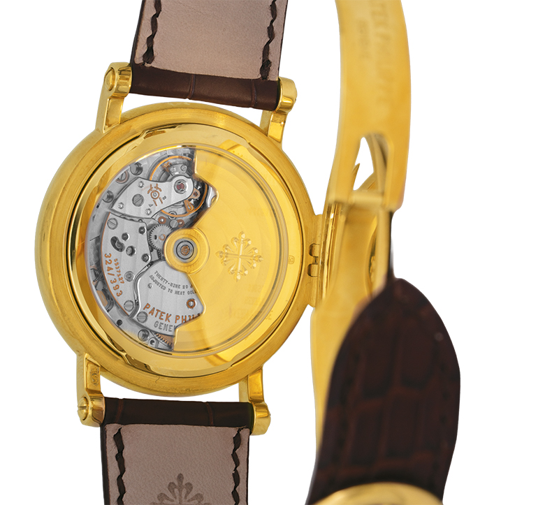 Pre-owned Patek Philippe Calatrava Officer’s 5153 watch, 38mm in 18k yellow gold with a silver dial, exhibition case back, brown leather strap, folding clasp, and automatic movement with box.