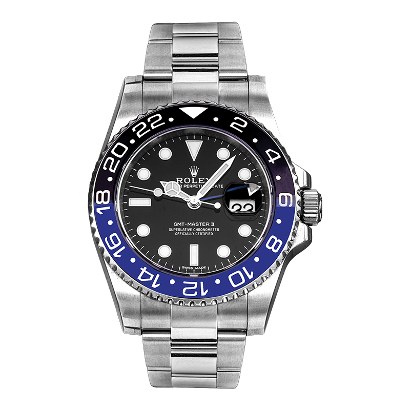 Pre-owned Rolex GMT-Master II watch, 40mm in stainless steel with a black dial, black and blue “Batman” ceramic bezel, Oyster bracelet, folding clasp, and automatic movement.
