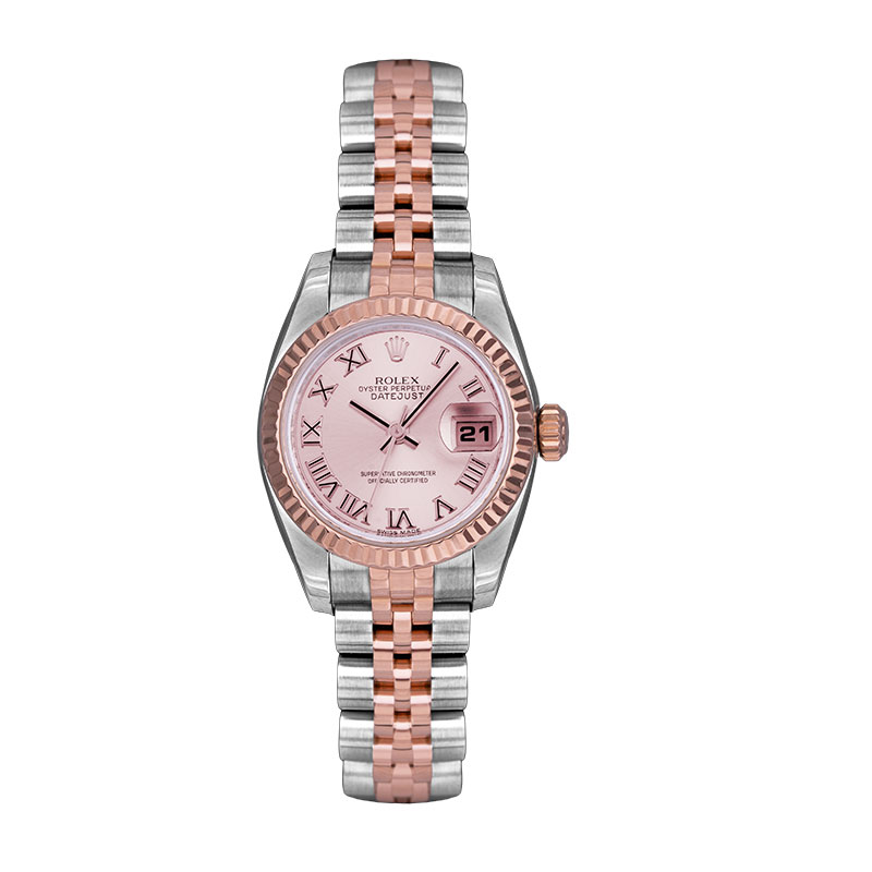 Pre-owned Rolex Datejust watch, 26mm in 18k rose gold & stainless steel with a rose dial, sapphire crystal, 18k rose gold fluted bezel, Jubilee bracelet, hidden folding clasp, and automatic movement.