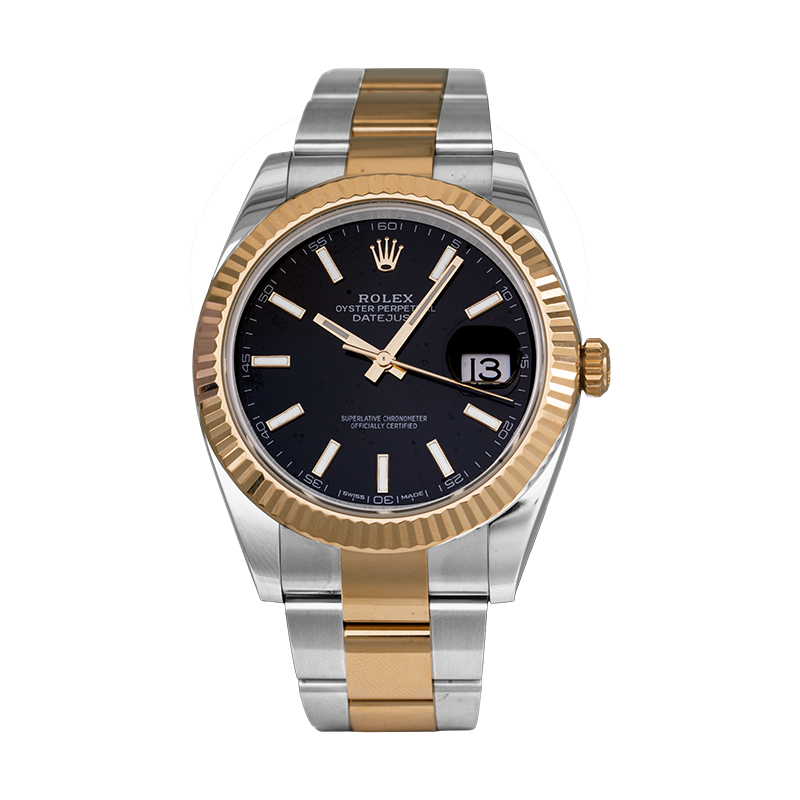 Pre-owned Rolex Datejust watch, 41mm in stainless steel & 18k yellow gold with a black dial, sapphire crystal, 18k yellow gold fluted bezel, Oyster bracelet, folding clasp, and automatic movement.