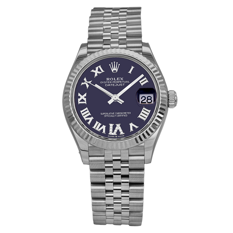 Pre-owned Rolex Datejust watch, 31mm in stainless steel with an aubergine dial & diamond IV, 18k white gold fluted bezel, Jubilee bracelet, folding clasp, and automatic movement.