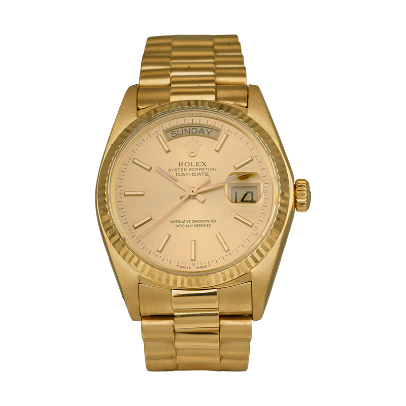Pre-owned Rolex Day-Date watch, 36mm in 18k yellow gold with a champagne dial, sapphire crystal, fluted bezel, President bracelet, folding clasp, and automatic movement.