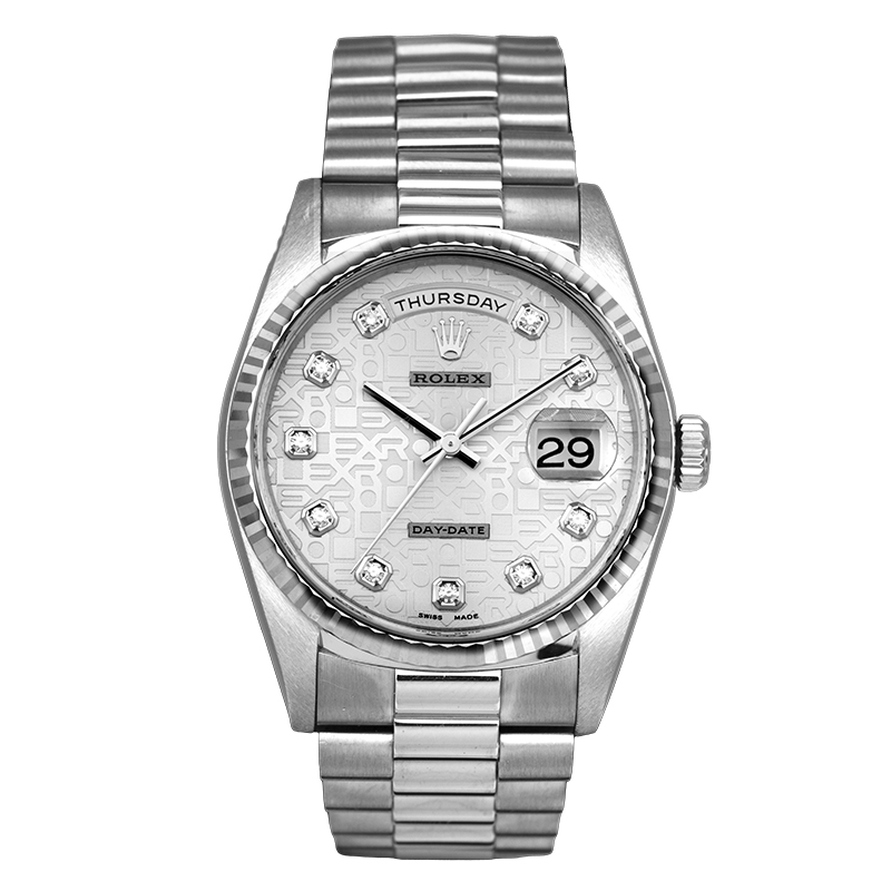 Pre-owned Rolex Day-Date watch, 36mm in 18k white gold golf with original silver diamond Jubilee dial, fluted bezel, President bracelet, folding clasp, and automatic movement.