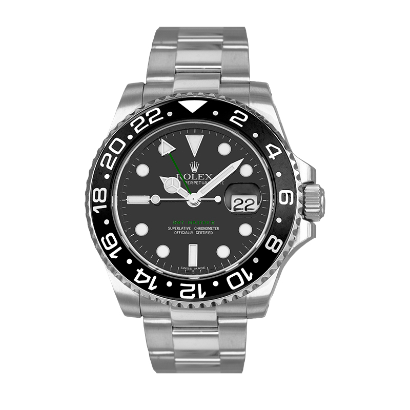Pre-owned Rolex GMT-Master II watch, 40mm in stainless steel with a black dial, black ceramic bezel, sapphire crystal, Oyster bracelet, folding clasp, and automatic movement.