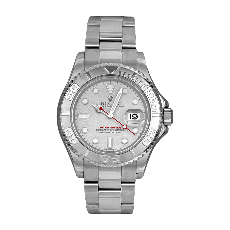 Pre-owned Rolex Yacht-Master watch, 40mm in stainless steel with a platinum dial & bezel, sapphire crystal, Oyster bracelet, folding clasp, and automatic movement.