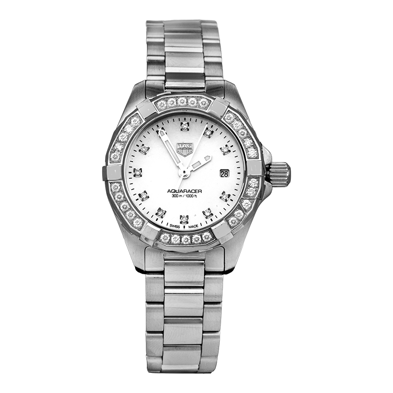 Pre-owned TAG Heuer Aquaracer watch, 27mm in stainless steel with a mother-of-pearl diamond dial, sapphire crystal, diamond bezel, folding clasp, and quartz movement with box.