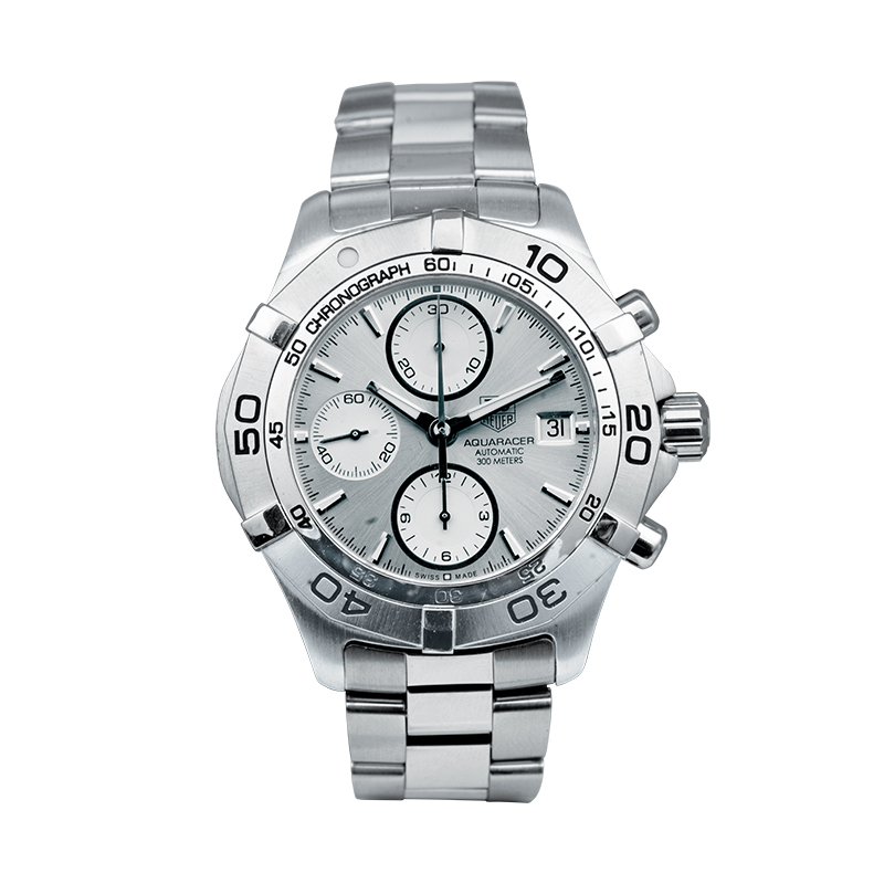 Pre-owned TAG Heuer Aquaracer Chrono watch, 41mm in stainless steel with a silver dial, sapphire crystal, folding clasp, and quartz movement.