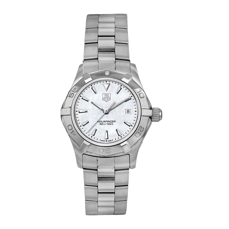 Pre-owned TAG Heuer Aquaracer watch, 27mm in stainless steel with a mother-of-pearl dial, sapphire crystal, rotating bezel, folding clasp, and quartz movement.