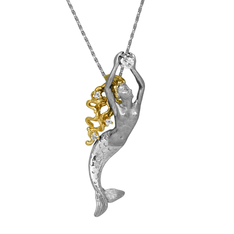 Vintage sterling silver & 14k yellow gold mermaid pendant set with 0.08 carats of single cut diamonds on a 16″ chain.