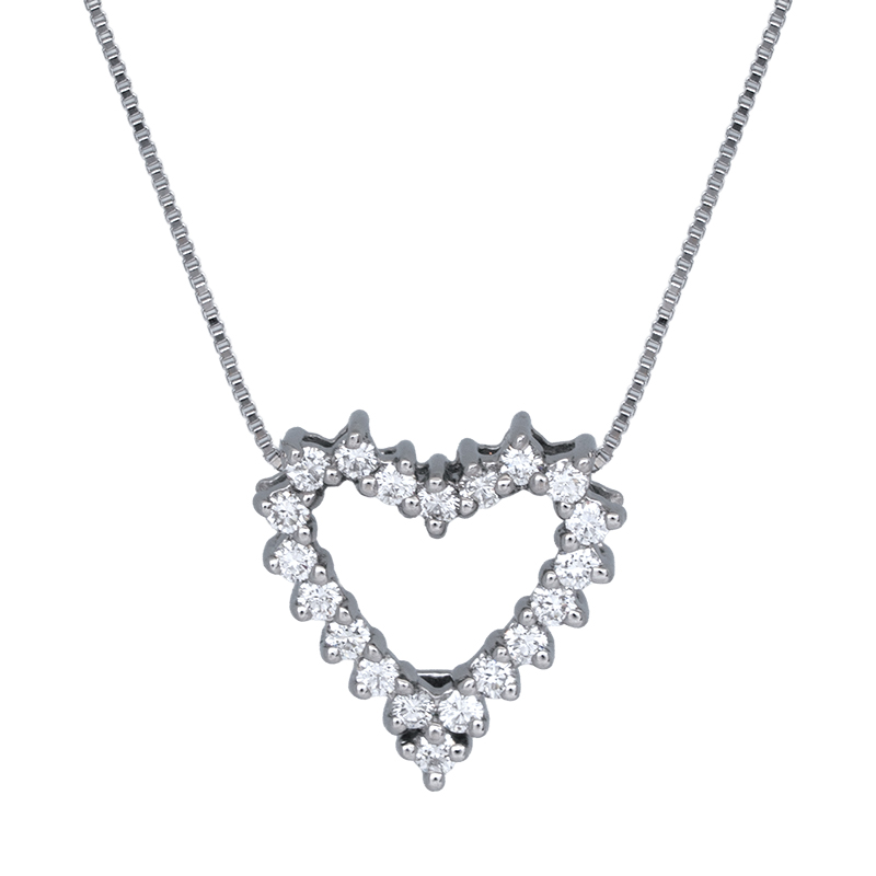 Vintage 18k white gold open heart pendant set with 0.20 carats of round brilliant diamonds on an 18″ chain.