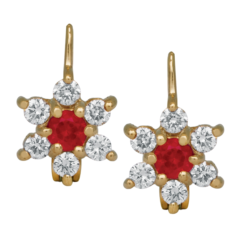 Vintage 14k yellow gold flower drop earrings set with 0.36 carats of round brilliant earth-mined diamonds & 0.10 carats of round brilliant rubies.