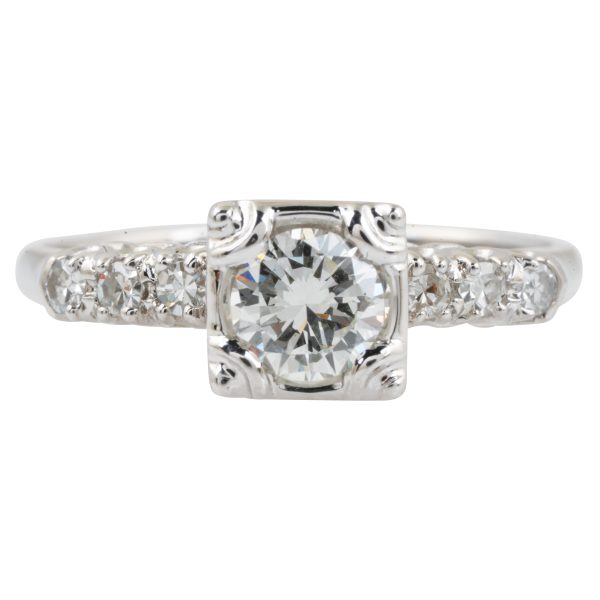 Vintage 14k white gold engagement ring centered with a 0.46 carat round brilliant diamonds with 0.12 carats of single cut diamonds in the band.