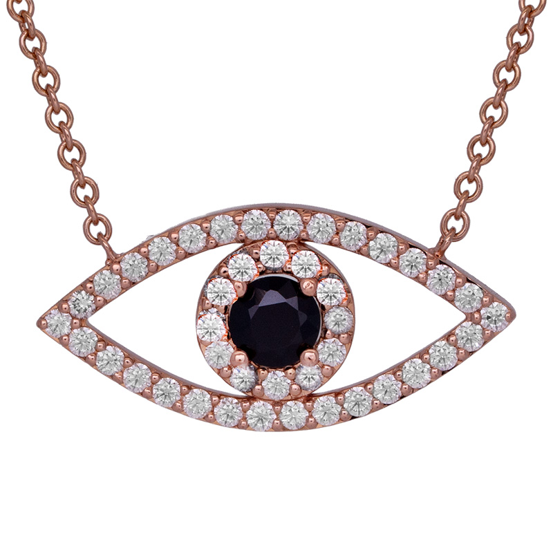 Vintage 18k rose gold Evil Eye pendant centered with a 0.20 carat round brilliant earth-mined black diamond surrounded by 0.42 carats of round brilliant earth-mined diamonds on a 15″ chain.