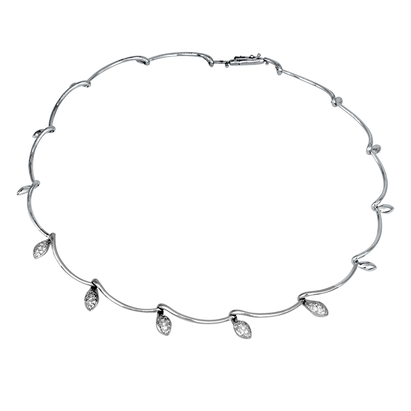 Vintage 18k white gold scalloped drop station necklace set with 0.66 carats of rounds brilliant diamonds.