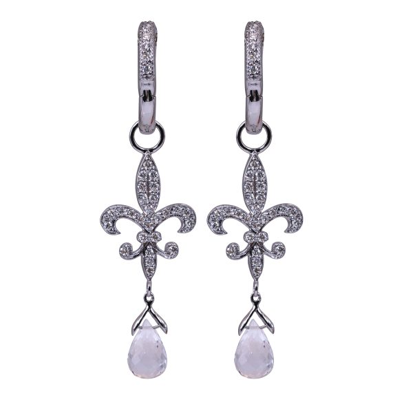 Vintage 14k white gold fleur-de-lis drop earrings set with 0.66 carats of round brilliant & briolette diamonds.