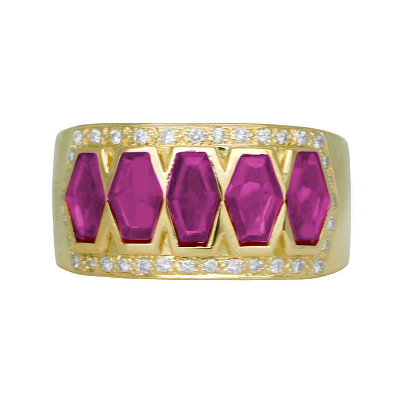 Vintage 18k yellow gold wide band set with 0.75 carats of shield cut deep pink sapphires & 0.17 carats of round brilliant earth-mined diamonds.