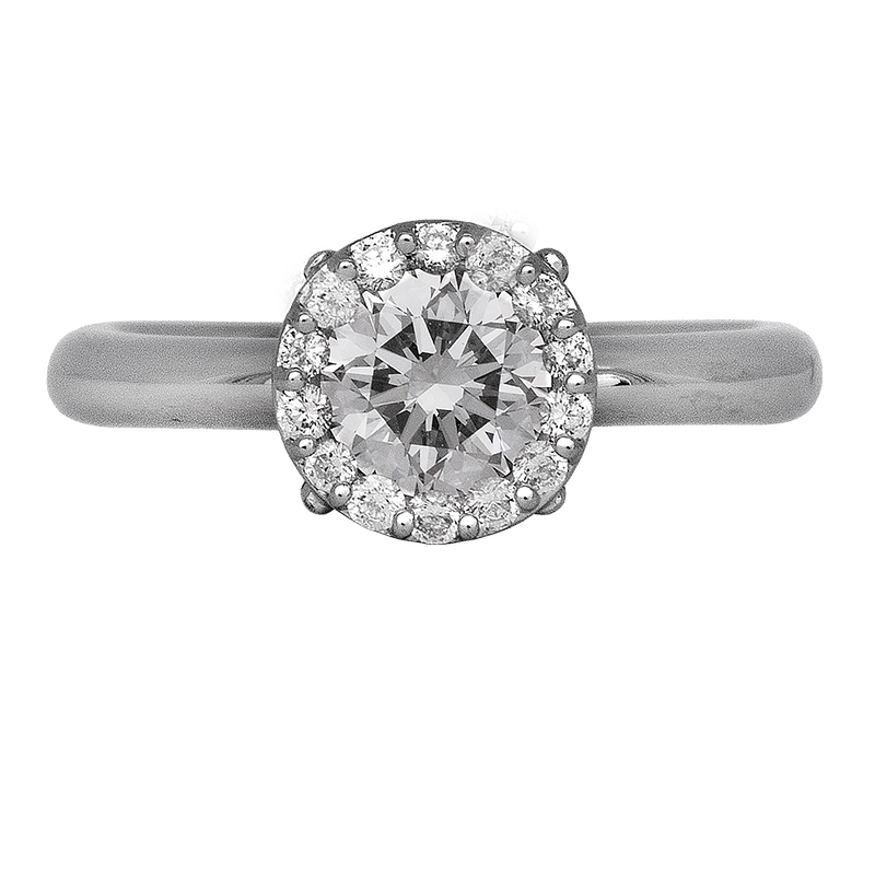Vintage platinum halo engagement ring centered with a 0.73 carat round brilliant earth-mined diamond surrounded by 0.14 carats of round brilliant earth-mined diamonds.