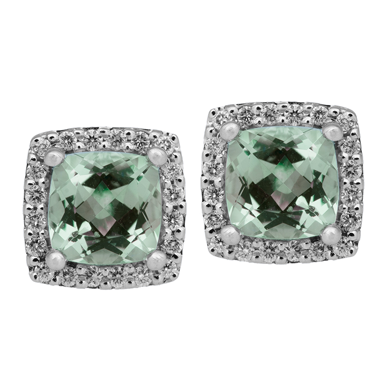 Vintage 14k white gold halo earrings centered with 0.92 carats of cushion prasiolite surrounded by 0.13 carats of round brilliant diamonds.