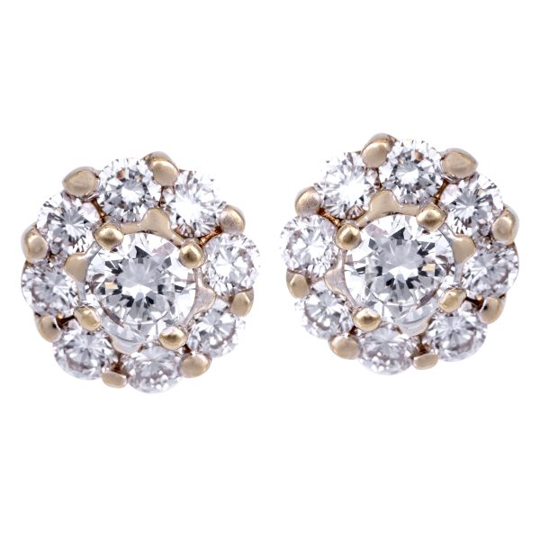 Vintage 14k yellow gold halo stud earrings set with 1.10 carats of round brilliant diamonds.
