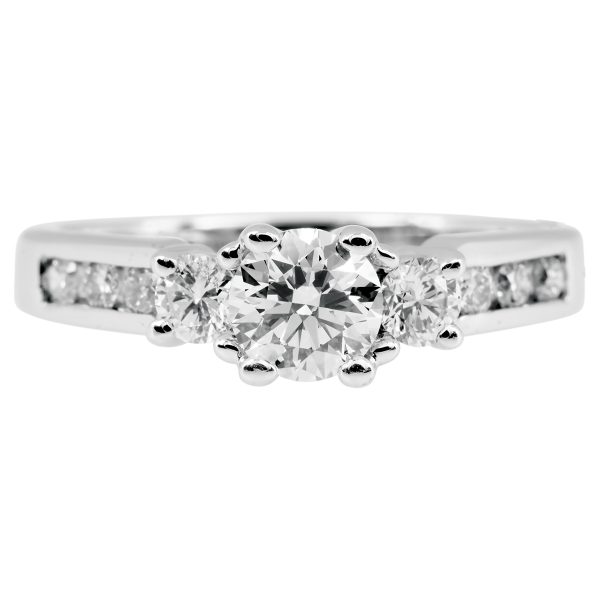 Vintage 18k white gold three-stone engagement ring centered with a 0.50 carat round brilliant diamond surrounded by 0.50 carats of round brilliant diamonds and 0.20 carats of round brilliant diamonds in the band.