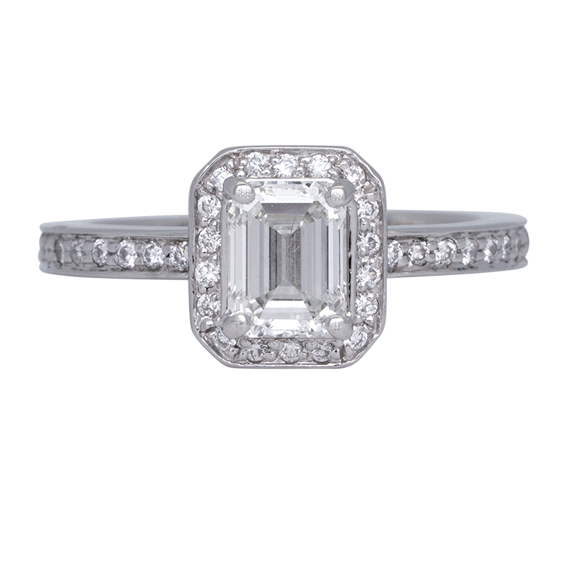 Vintage platinum engagement ring set with a 1.04 carat emerald cut diamond plus 0.23 carats of round brilliant earth-mined diamonds in the halo and band.