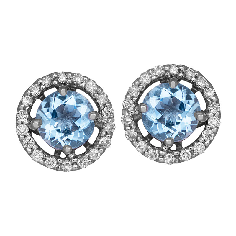 Vintage 18k white gold halo earrings centered with 1.12 carats of round brilliant aquamarine surrounded by 0.36 carats of round brilliant diamonds.