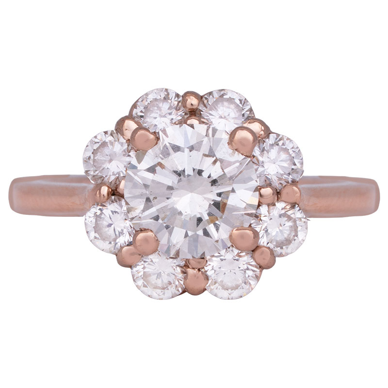 Vintage 14k rose gold halo engagement ring centered with a 1.05 carat round brilliant diamond surrounded by 0.80 carats of round brilliant diamonds.