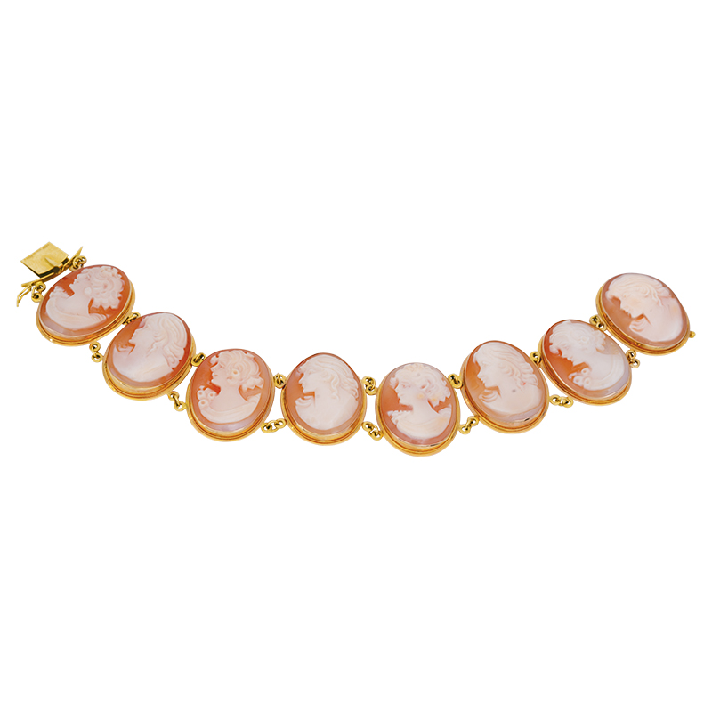 Vintage 14k yellow gold link bracelet set with a series of 25mm cameos.