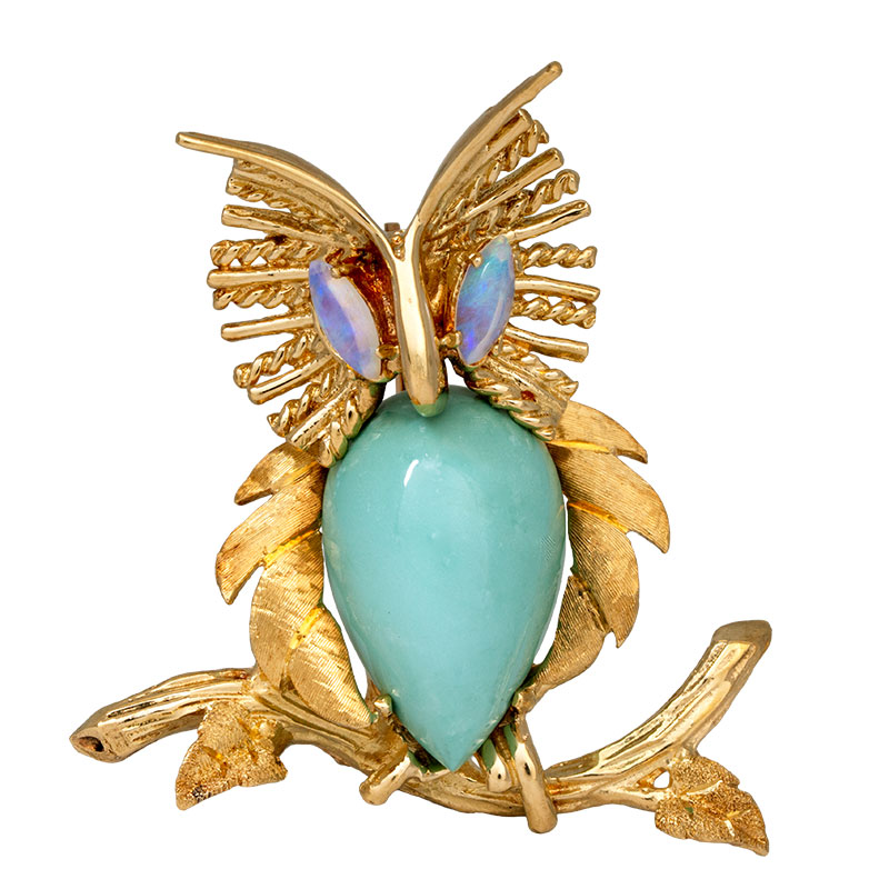 Vintage 14k yellow gold owl brooch set with turquoise & opal gemstones.