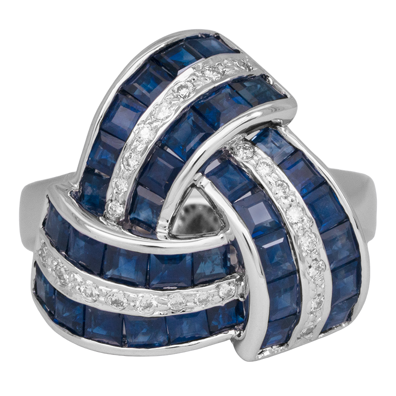 Vintage 14k white gold ribbon swirl ring set with 3.30 carats of princess sapphires & 0.48 carats of round brilliant earth-mined diamonds.