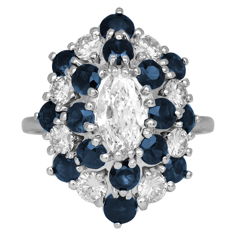 Vintage 18k white gold double halo ring centered with a 0.50 carat marquise diamond surrounded by 1.60 carats of round brilliant sapphires & 0.44 carats of round brilliant diamonds.