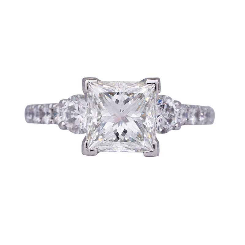 Vintage platinum engagement ring set with a 2.01 carat princess cut diamond and 0.80 carats of round brilliant diamonds.