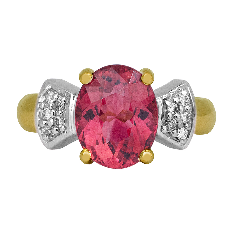 Vintage 14k yellow & white gold ring centered with a 2.71 carat oval rubellite tourmaline flanked by 0.10 carats of round brilliant earth-mined diamonds.