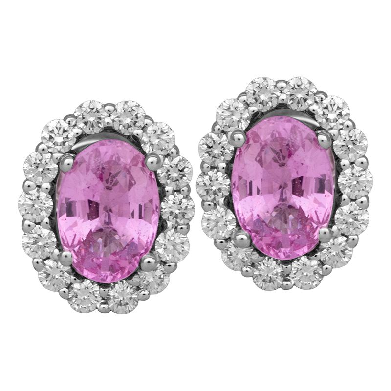 Vintage 14k white gold earrings centered with 2.00 carats of oval pink sapphires surrounded by 1.05 carats of round brilliant diamond haloes.