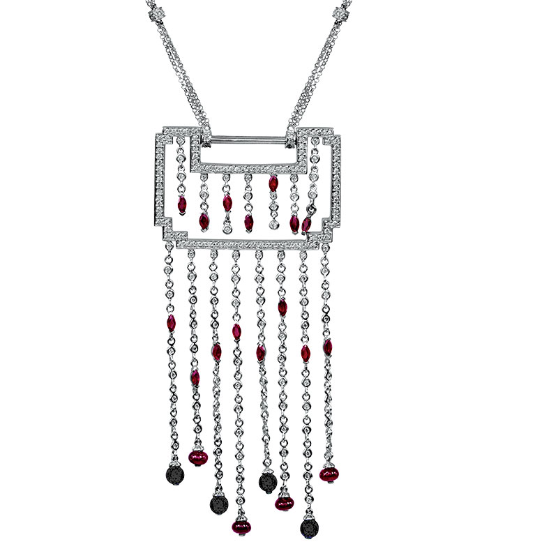 Vintage 14k white gold dangle necklace set with 1.50 carats of round brilliant diamonds, 1.95 carats of marquise rubies, and beaded rubies & onyx.