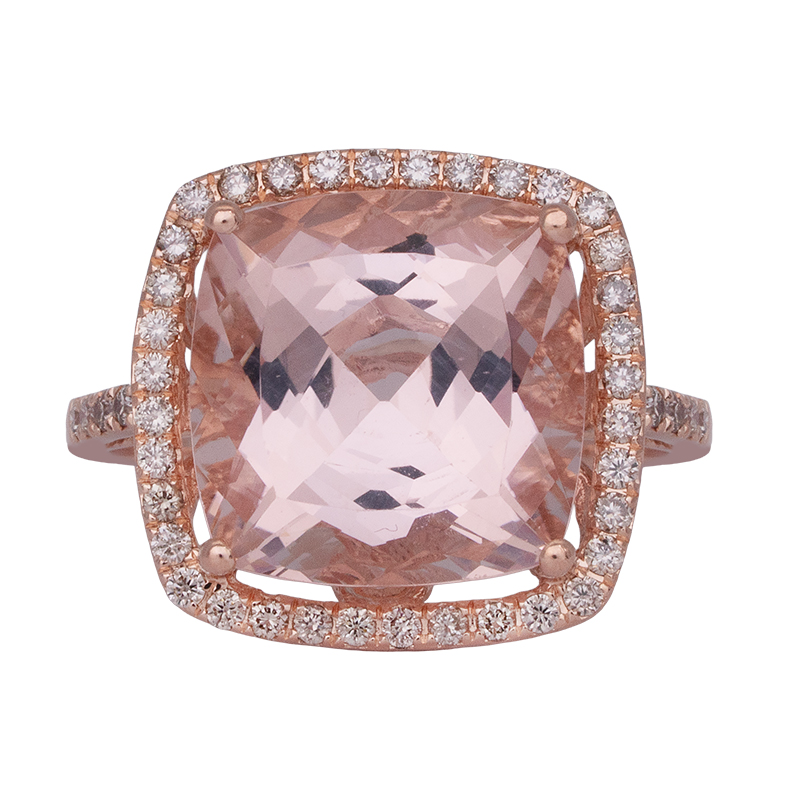 Vintage 14k rose gold halo ring centered with a 7.00 carats cushion morganite surrounded by 0.45 carats of round brilliant earth-mined diamonds.