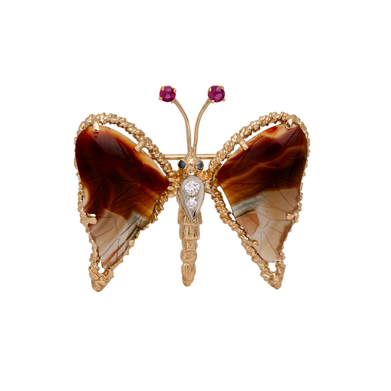 Vintage 18k yellow butterfly brooch set with carved agate wings, 0.20 carats of round brilliant rubies, 0.07 carats of round brilliant diamonds, and 0.02 carats of round brilliant sapphires.