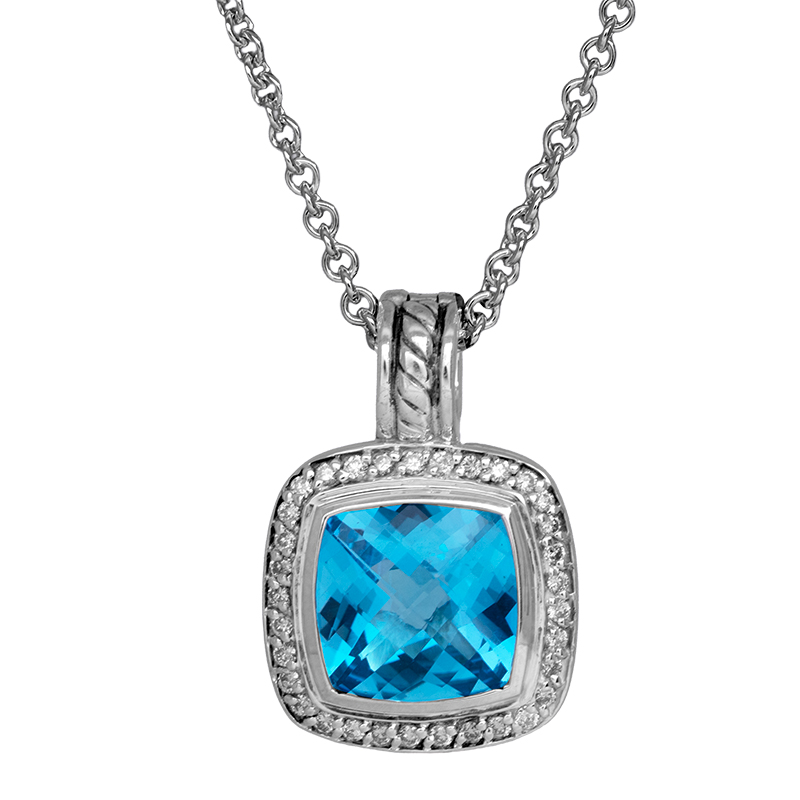 Vintage sterling silver David Yurman Albion pendant set with a 1.83 carat cushion blue topaz surrounded by 0.17 carats of round brilliant diamonds. Shown on a sterling silver chain for $85.