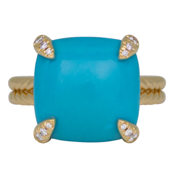 Vintage 18k yellow gold David Yurman Chatelaine ring centered with a cushion cabochon turquoise surrounded by 0.05 carats of round brilliant diamond prongs.
