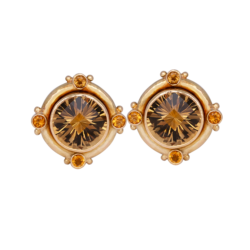 Vintage 18k yellow gold Elizabeth Locke earrings set with 9.70 carats of checkerboard & round brilliant citrines.